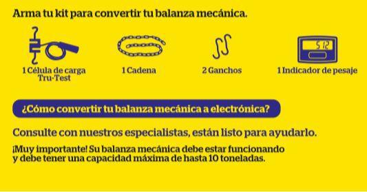 Si usted tiene una báscula mecánica, que esté en buen estado, y quiere entrar a la tecnología de tener una báscula electrónica para obtener sus ventajas como: pesaje rápido, preciso, simple, con posibilidad de tener pesos individuales en su teléfono móvil al momento de pesar, estabiliza en segundos el peso aunque el animal se mueve, guardar y enviar las sesiones de pesaje al momento, tener gran capacidad de guardar sus datos de pesaje, indicador que soporta el trabajo de campo difícil y extremo, con capacidad de almacenar números de arete electrónico, batería interna recargable de larga duración y con el respaldo de la compañía líder en pesaje electrónico de ganado lo puede hacer convirtiéndola mediante un proceso sencillo utilizando una celda de carga tipo S en su báscula mecánica.