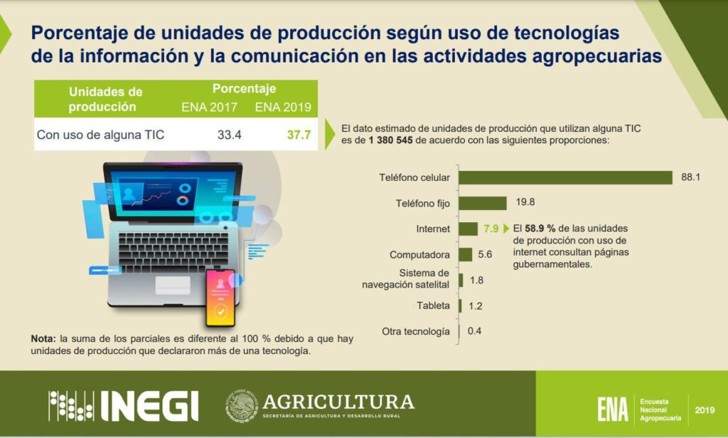 También cabe mencionar que la penetración de las tecnologías digitales en el sector agroalimentario en México se mantiene en un nivel bajo para los productores de pequeña escala, particularmente los que están ubicados al sur del país, hecho que contrasta con los grandes-agroproductores de exportación (O. et al., 2021), las TIC ´s no han permeado en el mismo nivel con los pequeños productores de ahí la importancia de políticas públicas para acercar las TIC ‘s a los grupos menos favorecidos y empujarlos al crecimiento, para lo que se necesitan estrategias para aseguras que las TIC´ s sean más accesibles y amigables, la figura 2 muestra el uso de las TIC ‘s en las actividades agropecuarias en México según la última Encuesta del Sector Agropecuario (ENA) 2019.