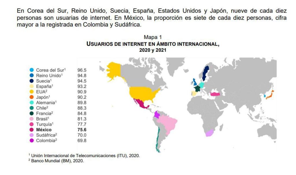 Según la ONU las proyecciones prevén que para el 2050 haya una población de 9,700 millones de personas que indicarían un 20% más de población respecto al 2020, esto llevaría a un incremento obligado del 70% de producción agrícola, por lo que para el sector agropecuario la incorporación de innovación es inminente, lo que ayudaría para el cumplimiento del ODS 2 de Cero Hambre que está en la agenda 2030 de la ONU y paralelamente vaya de la mano con la reducción del impacto de los gases de efecto invernadero que actualmente impacta en un 22% y ser más eficiente en el consumo de la energía que es del 30% (Iberdrola, 2024). En la figura 3 se puede observar el uso de internet en los hogares comparado con otros 13 países según informe de (ENDUTIH) 2021.