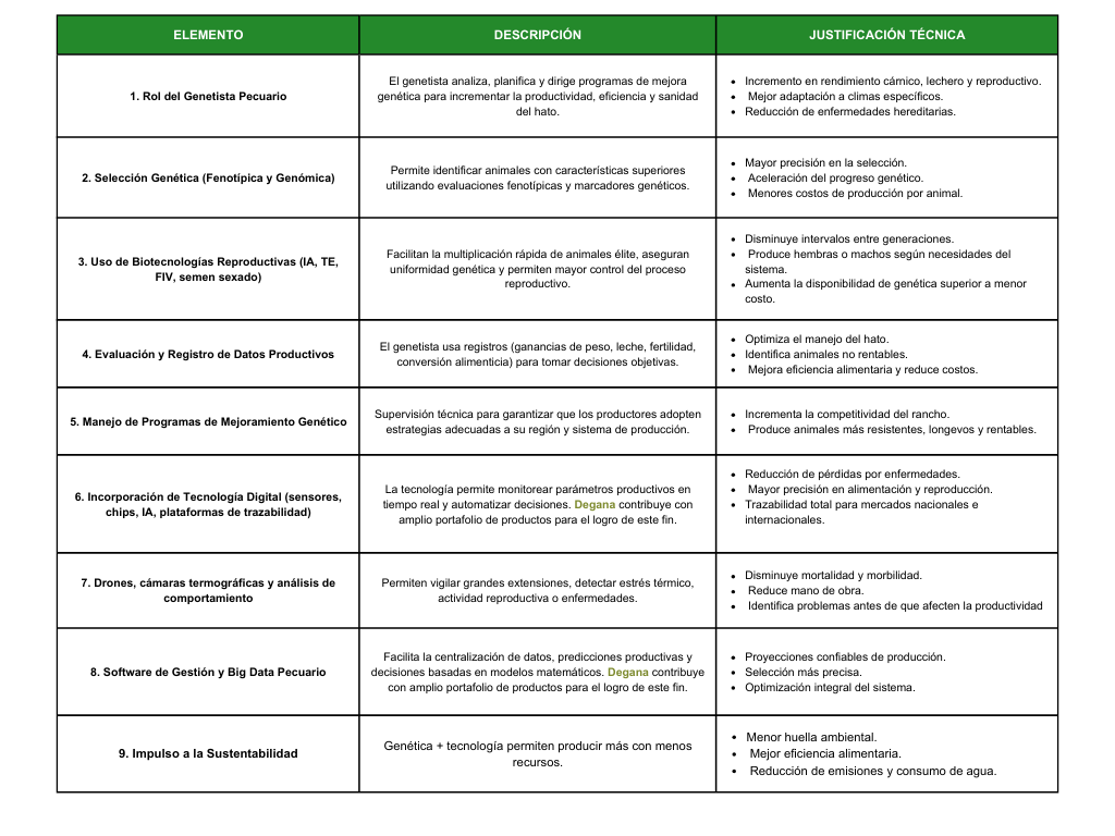 El genetista es fundamental para el desarrollo competitivo del sector pecuario moderno. Su labor, combinada con tecnologías avanzadas de análisis, reproducción y monitoreo digital, permite incrementar la productividad, mejorar la sanidad, reducir costos y elevar la sustentabilidad de los sistemas ganaderos, Degana contribuye con su amplio portafolio de productos para lograr esta gran labor como se muestra en el siguiente cuadro.